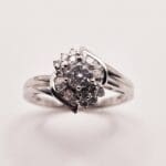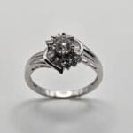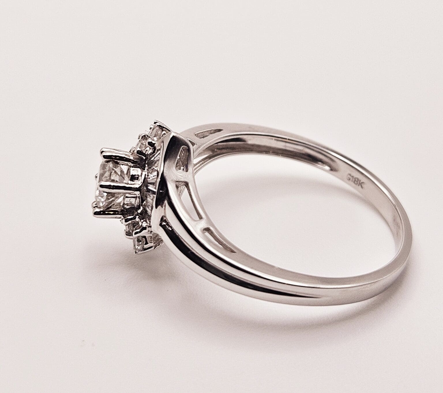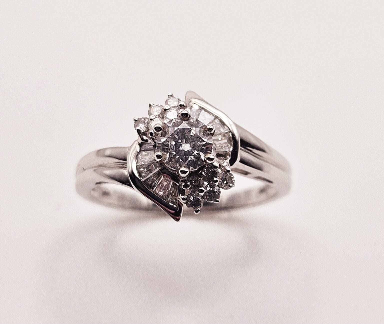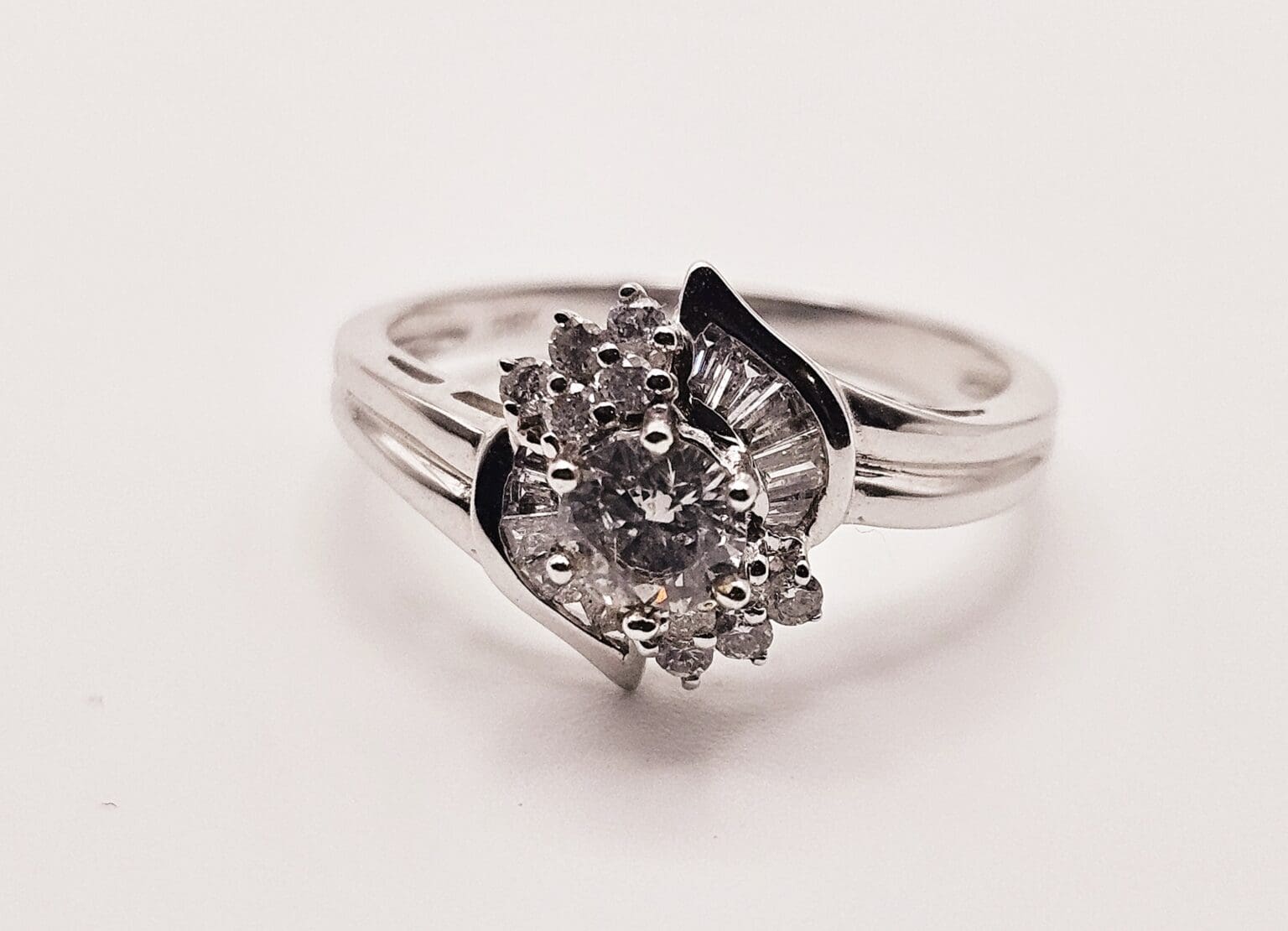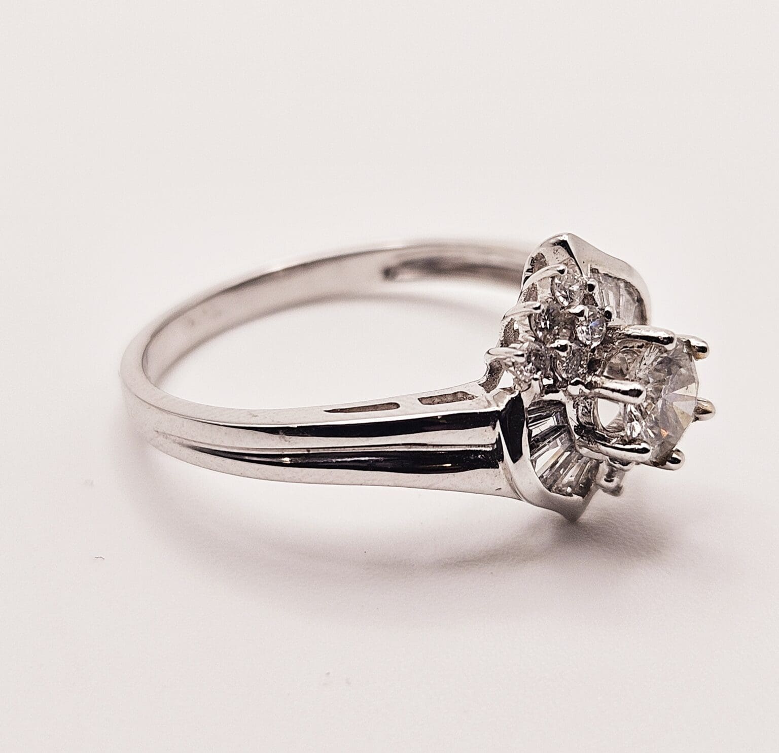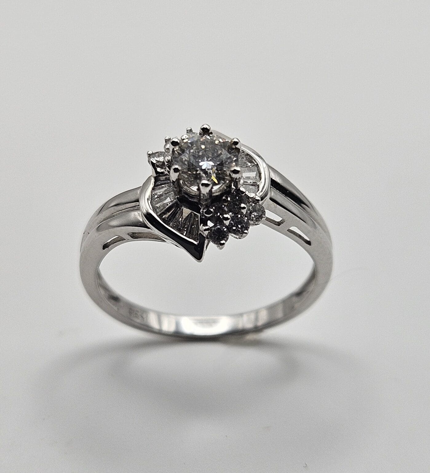 Gorgeous 18K solid white gold 1 carat total weight genuine diamond cathedral style ring with round cut center stone and baguette and round cut accent stones. Signed and tested 18K G.