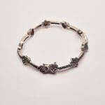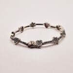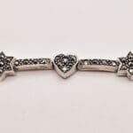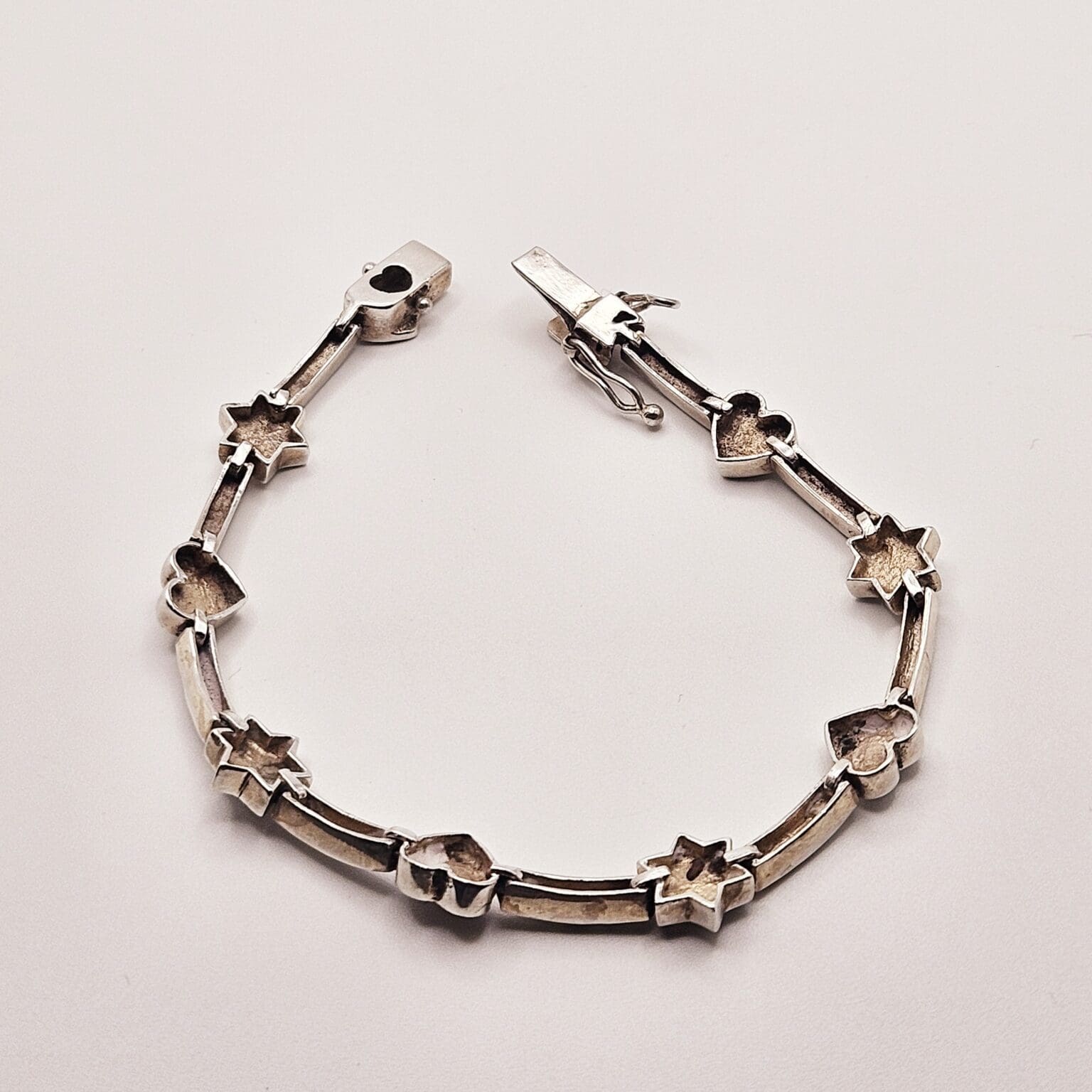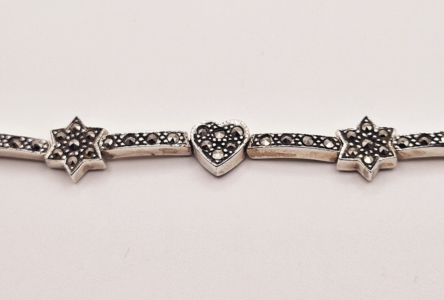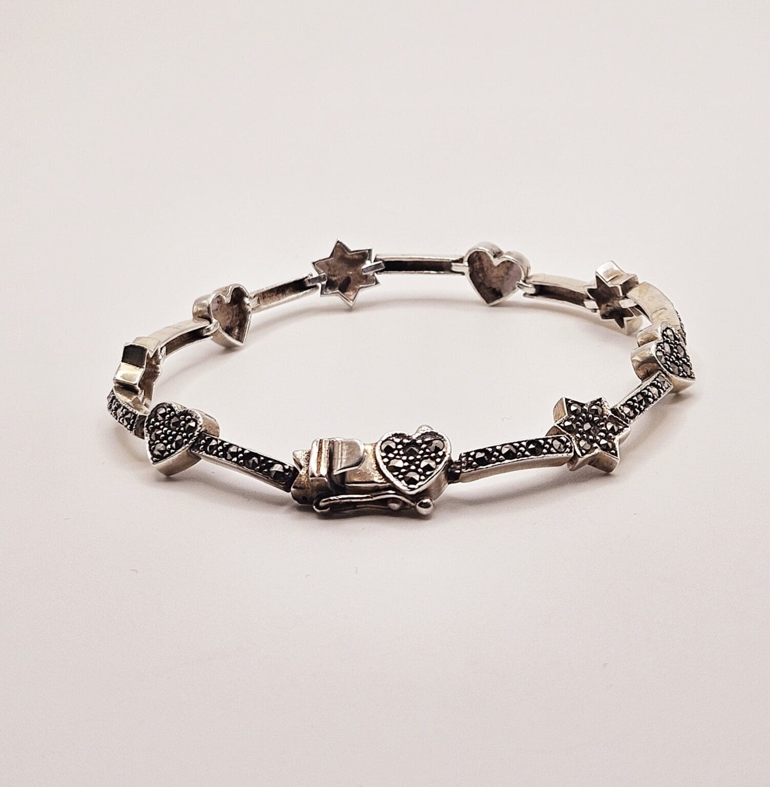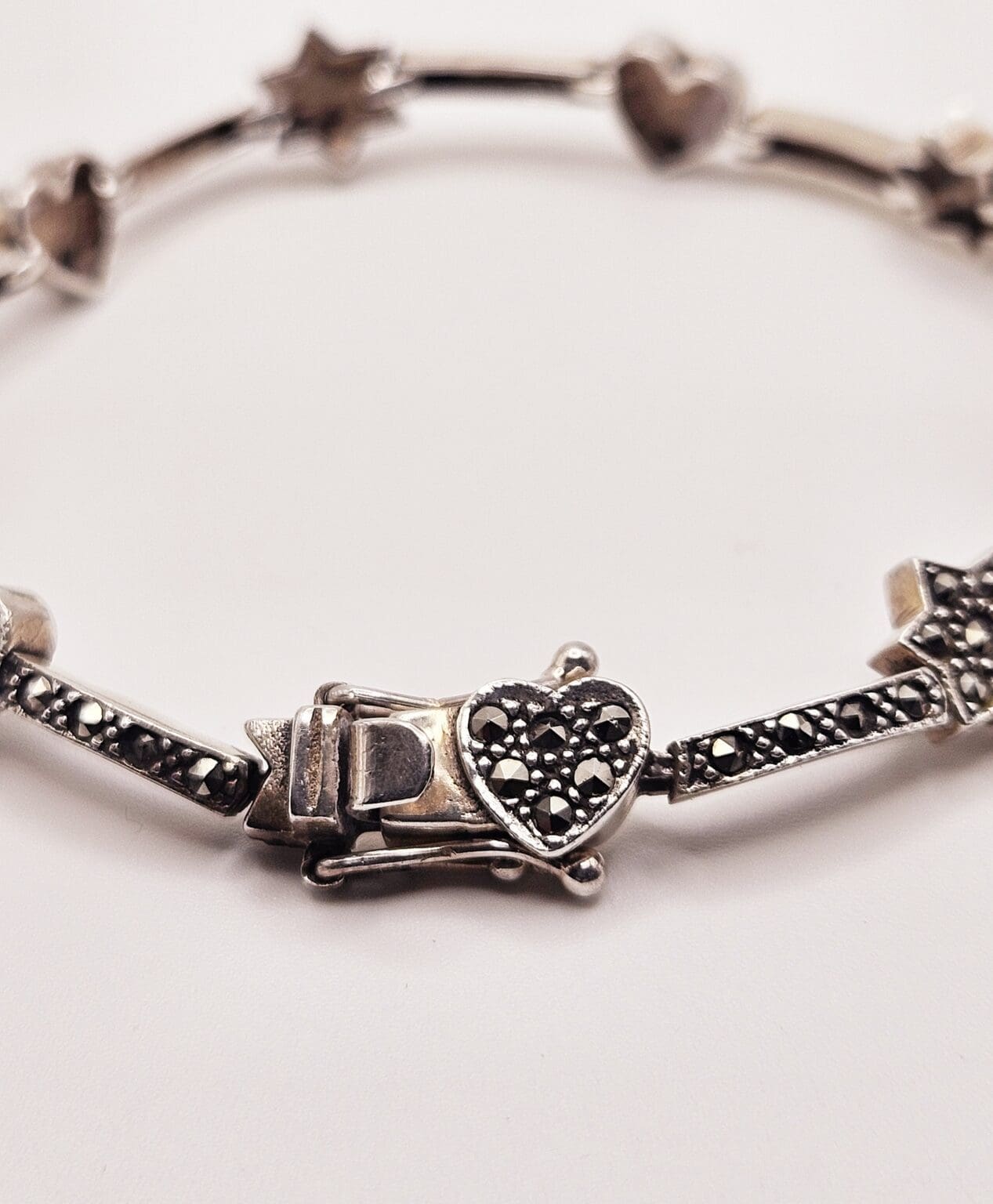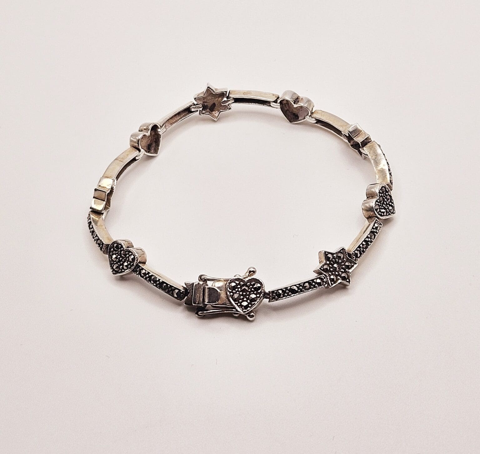 Stunning sterling silver heart and star link bracelet with marcasite accent stones and security clasp. Tested 925.