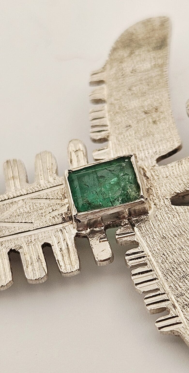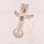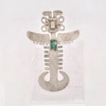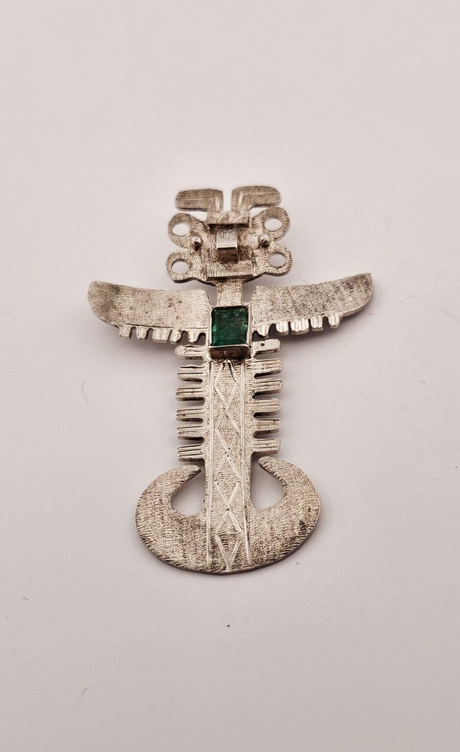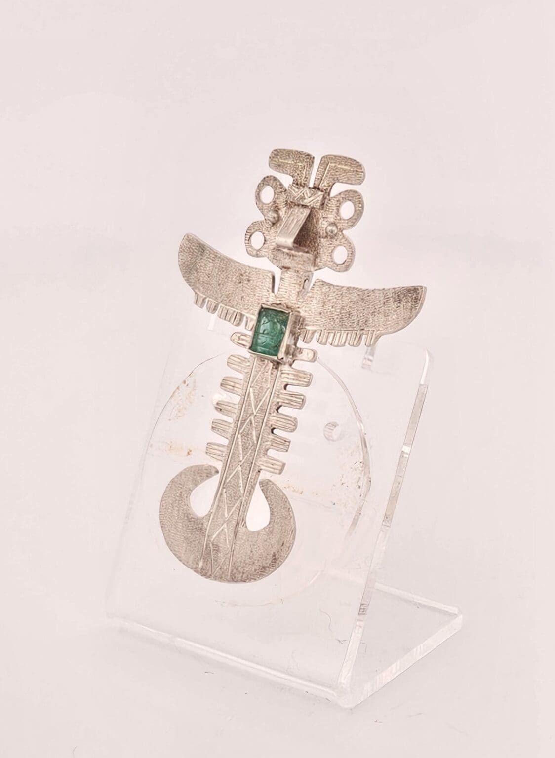Stunning sterling silver native etched Aztec god emerald pendant. It used to be a pin/pendant but the pin is no longer intact. There is also a small crack in the stone.