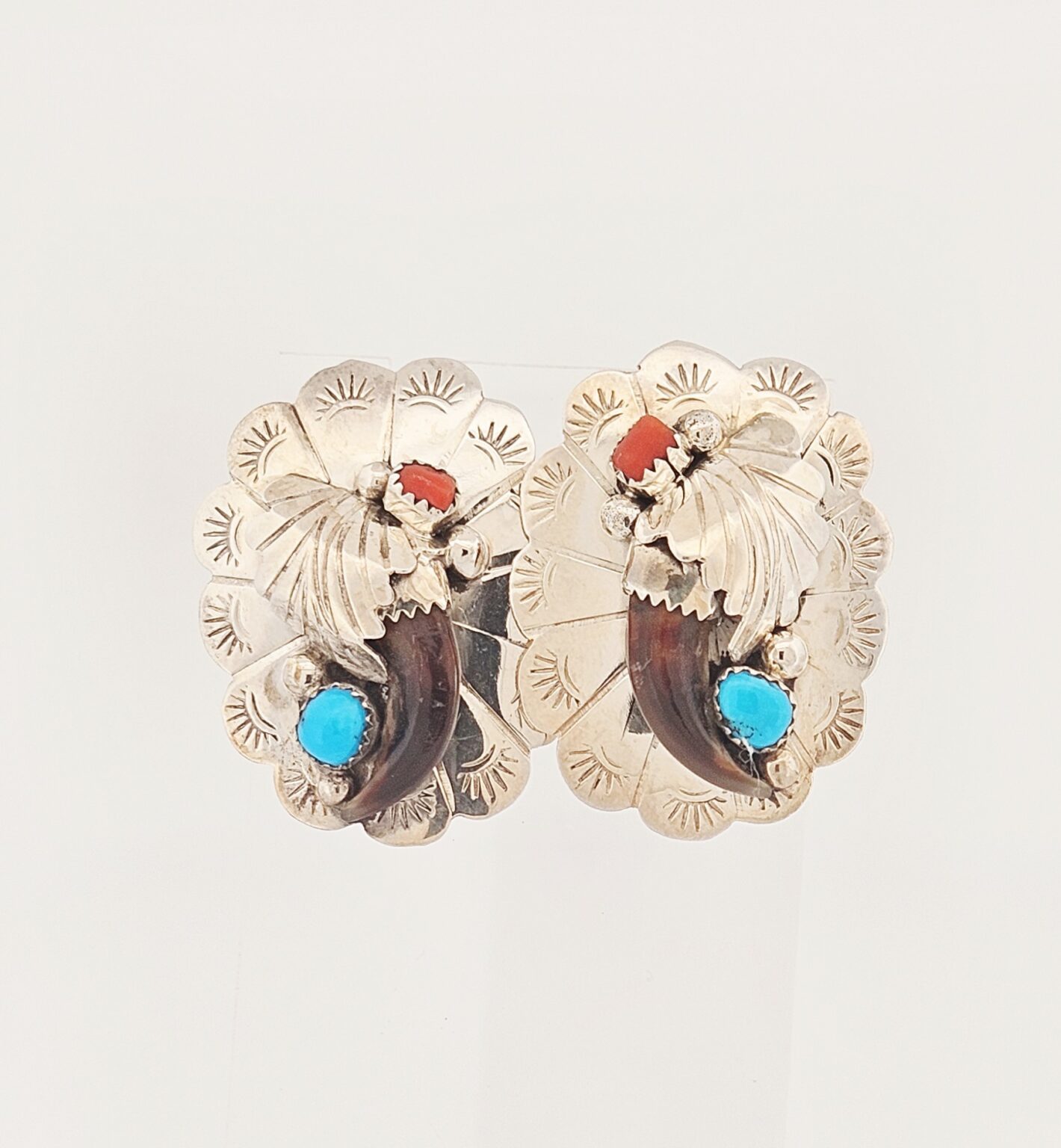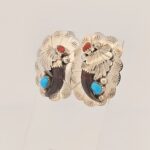 Beautiful sterling silver native turquoise & coral concho oval post back earrings. Stamped sterling.