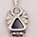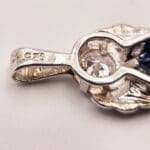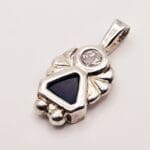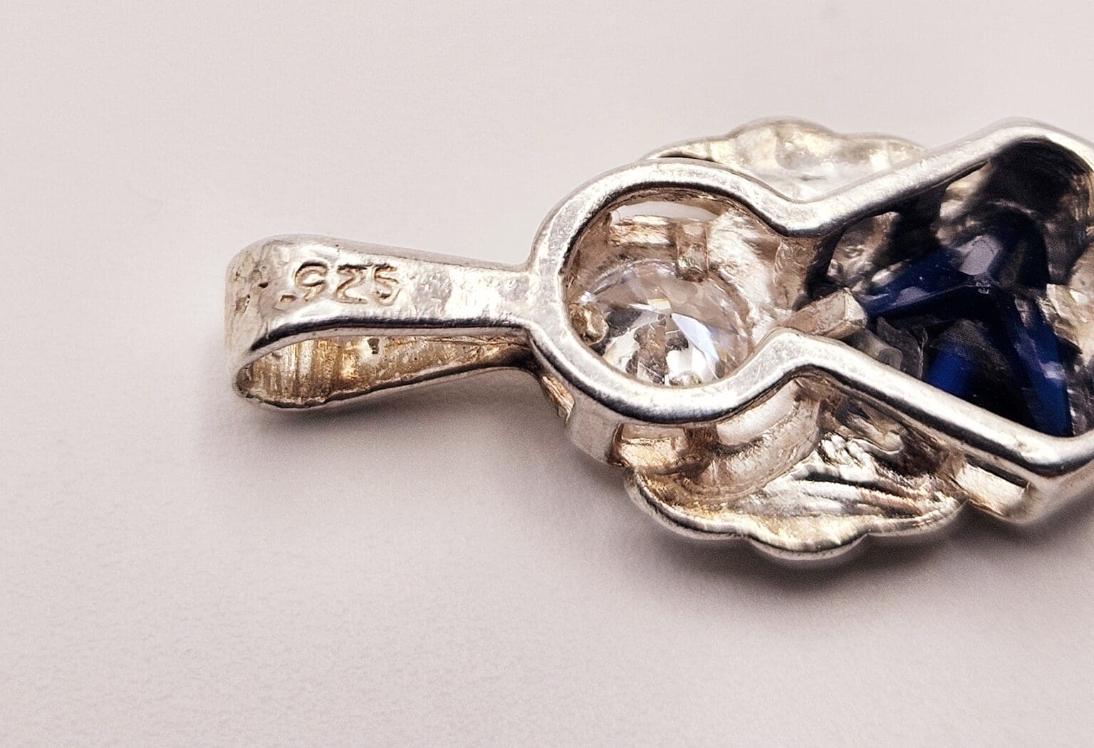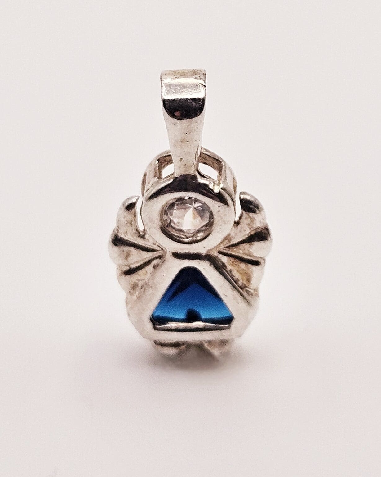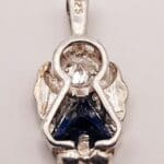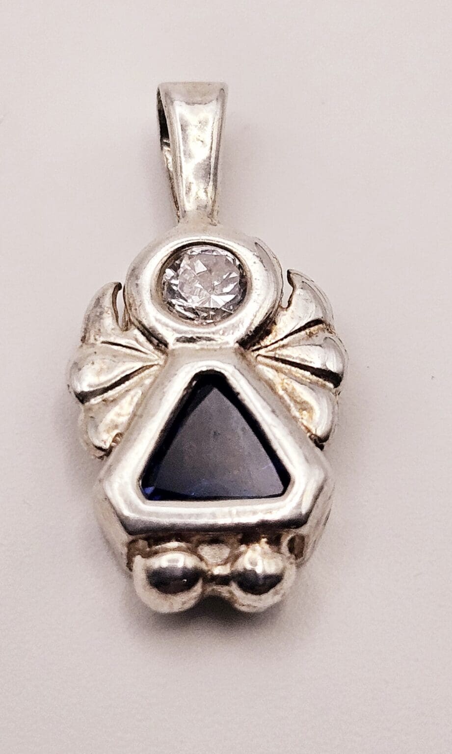 Charming sterling silver September birthstone angel pendant with tanzanite and cz stones. Stamped 925.