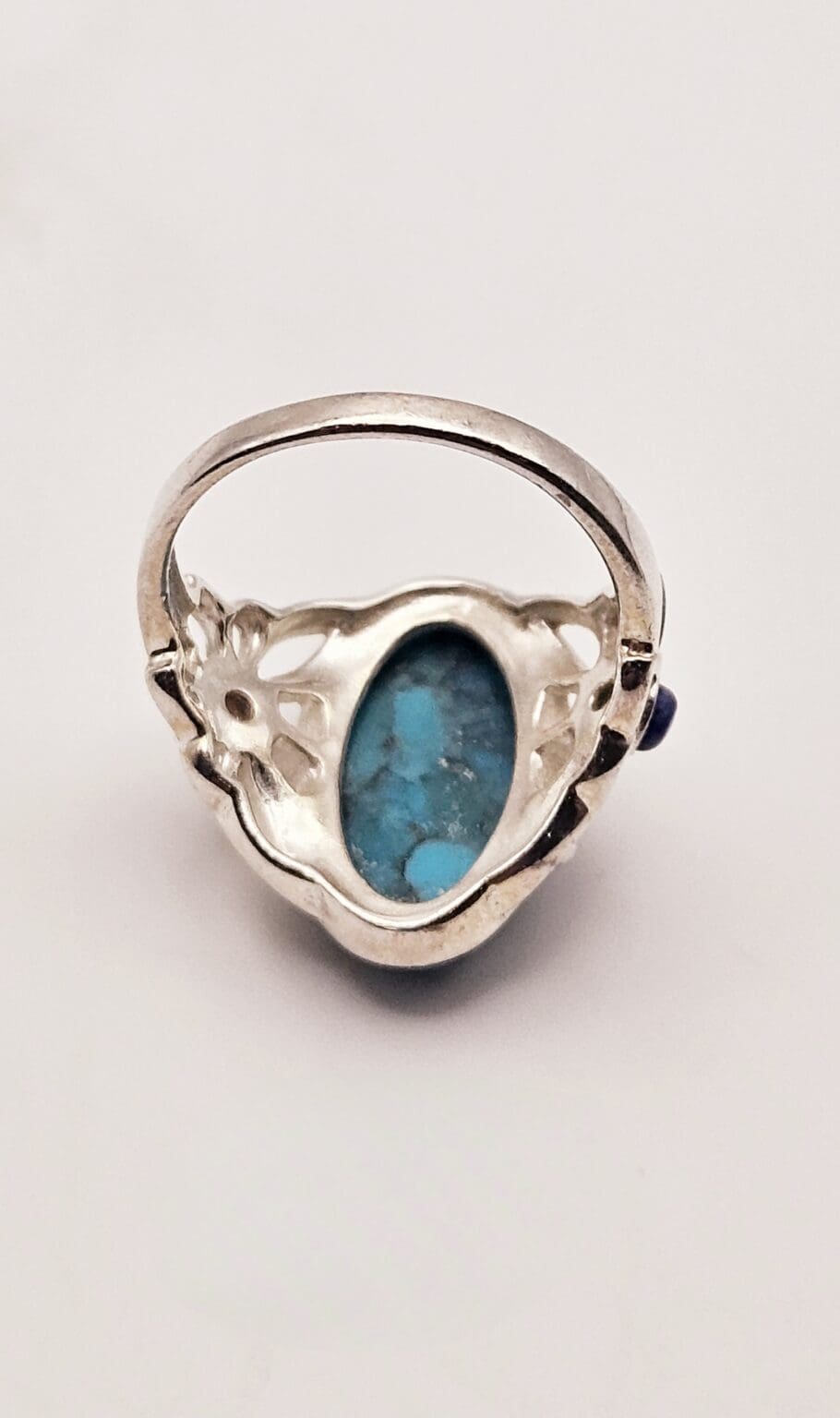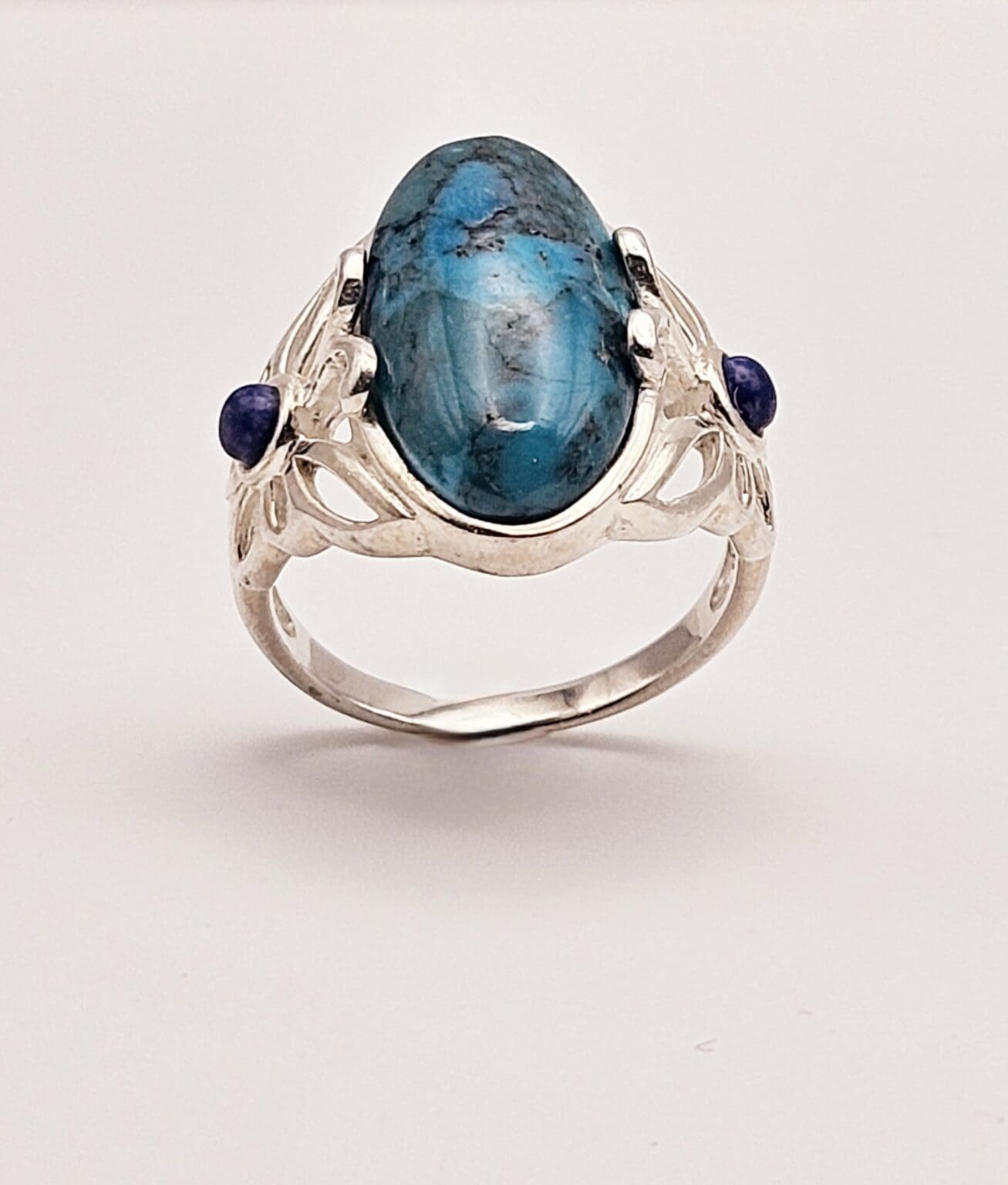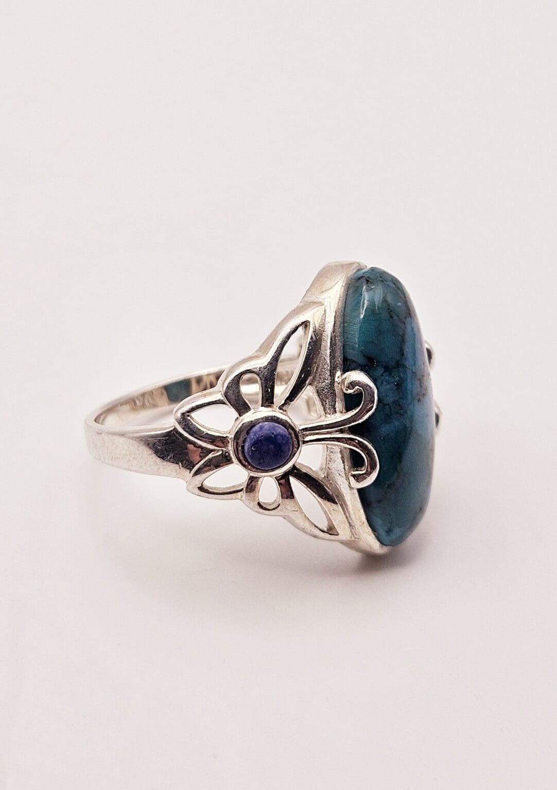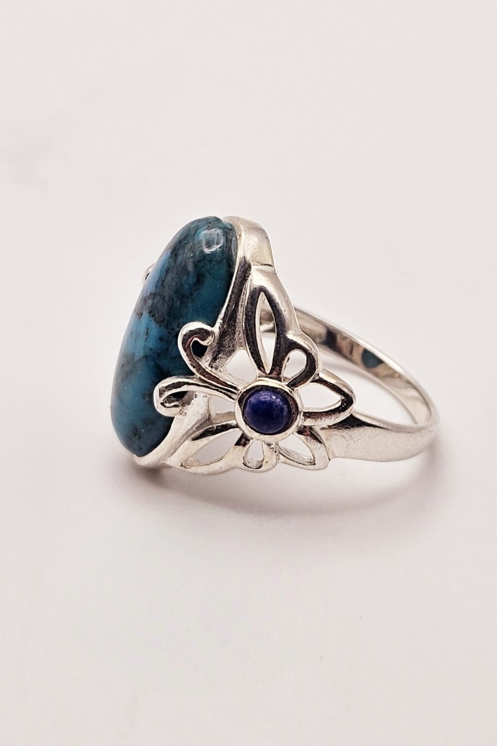 Stunning sterling silver turquoise cabochon ring with lapis lazuli accent stone with beautiful butterfly design. Signed THAILAND 925.