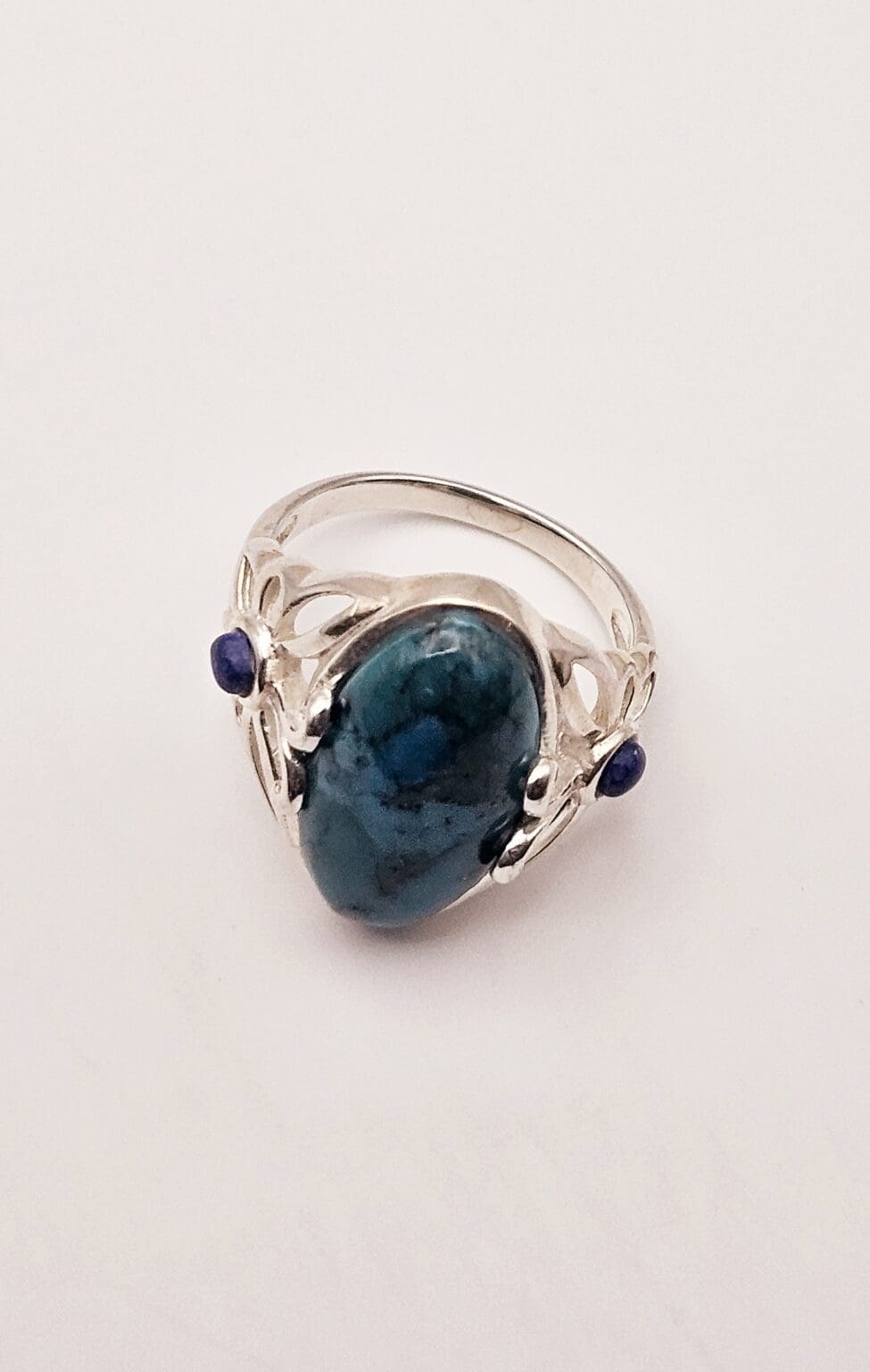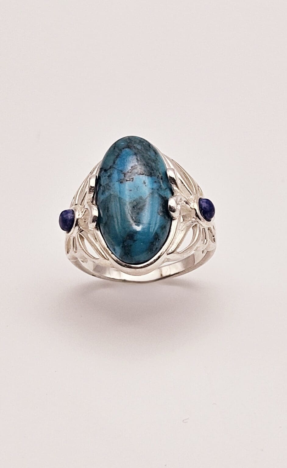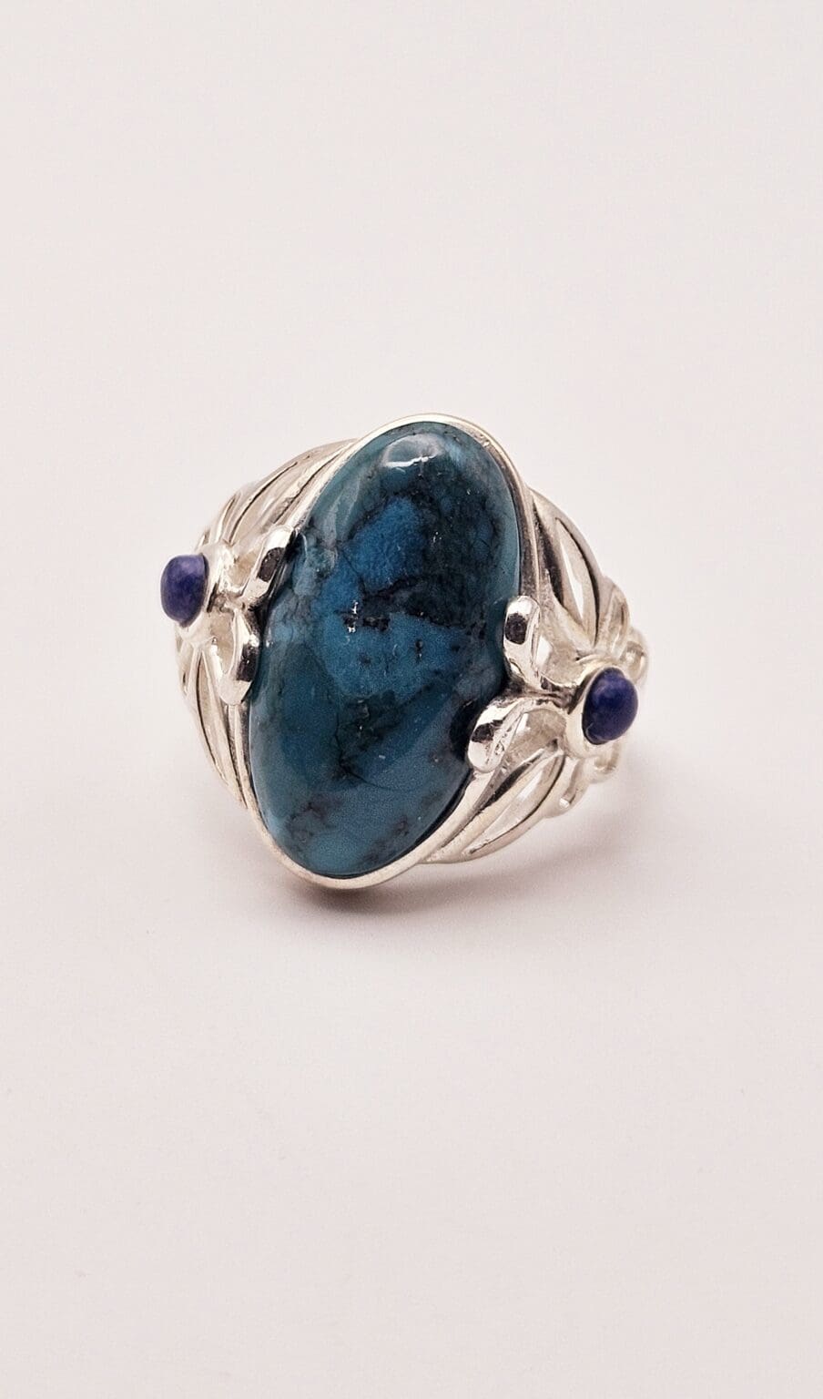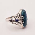 Stunning sterling silver turquoise cabochon ring with lapis lazuli accent stone with beautiful butterfly design. Signed THAILAND 925.