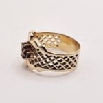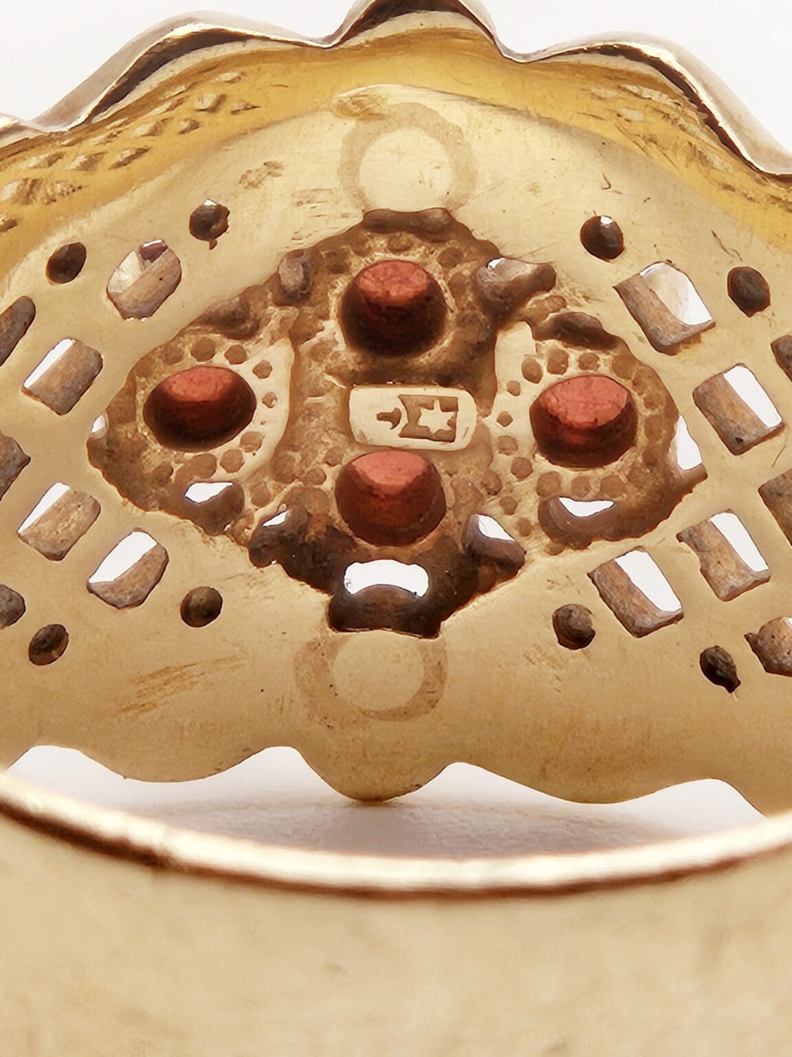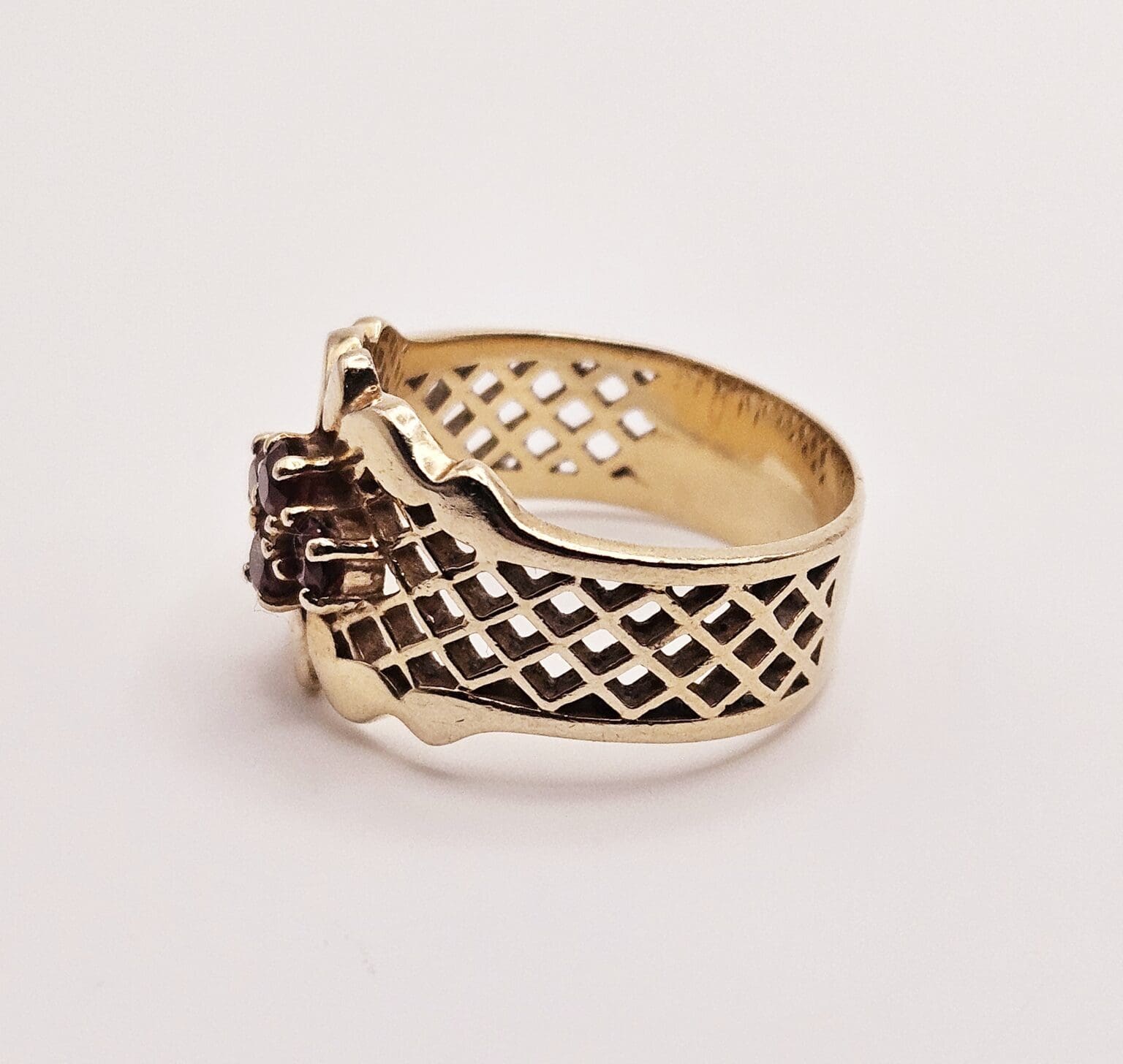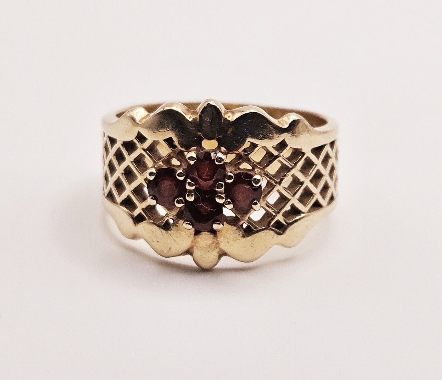 Beautiful vintage to antique 14k solid gold and genuine ruby cluster ring with open metal work design. Stamped with unidentified makers mark, tested 14k.